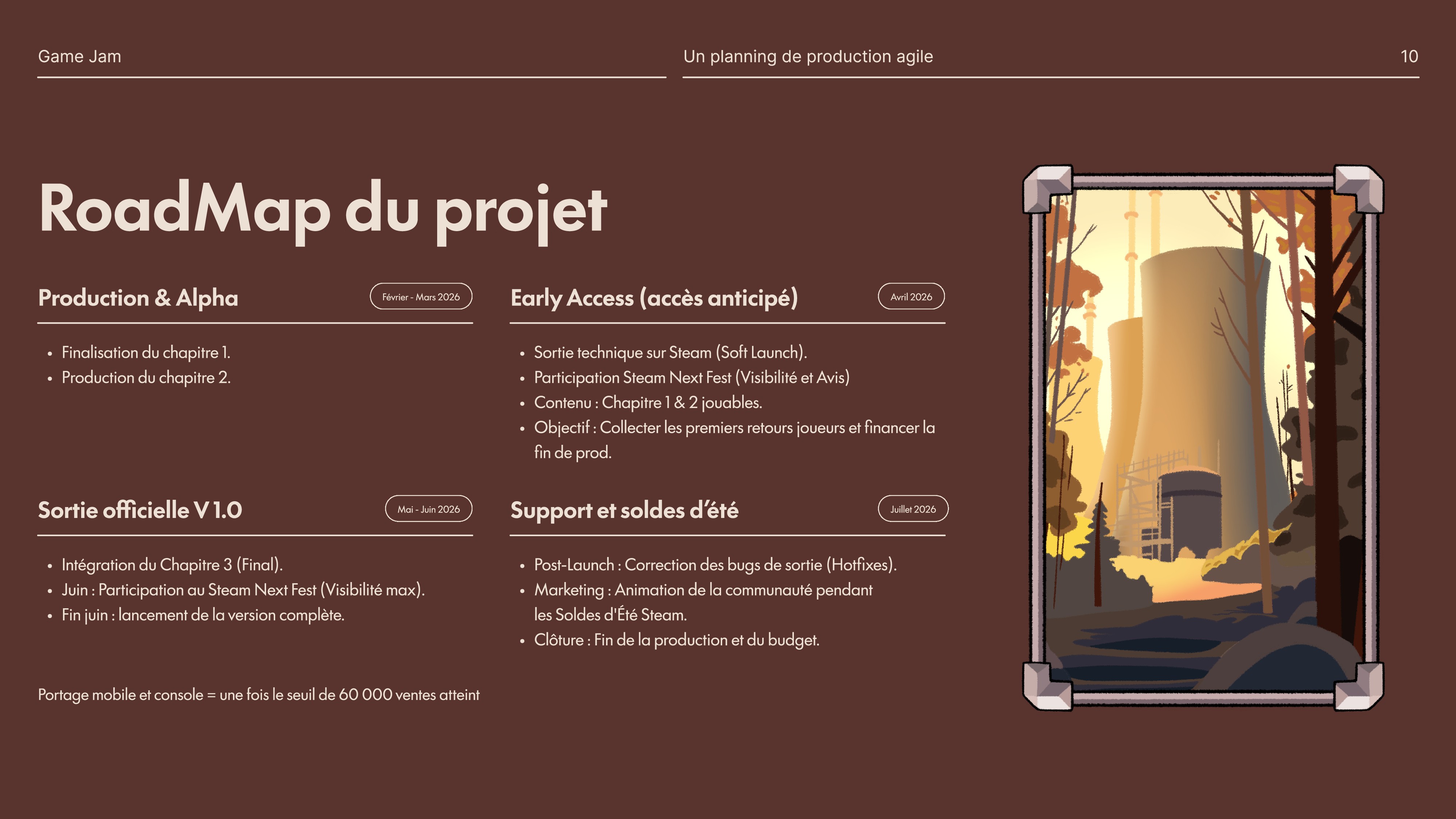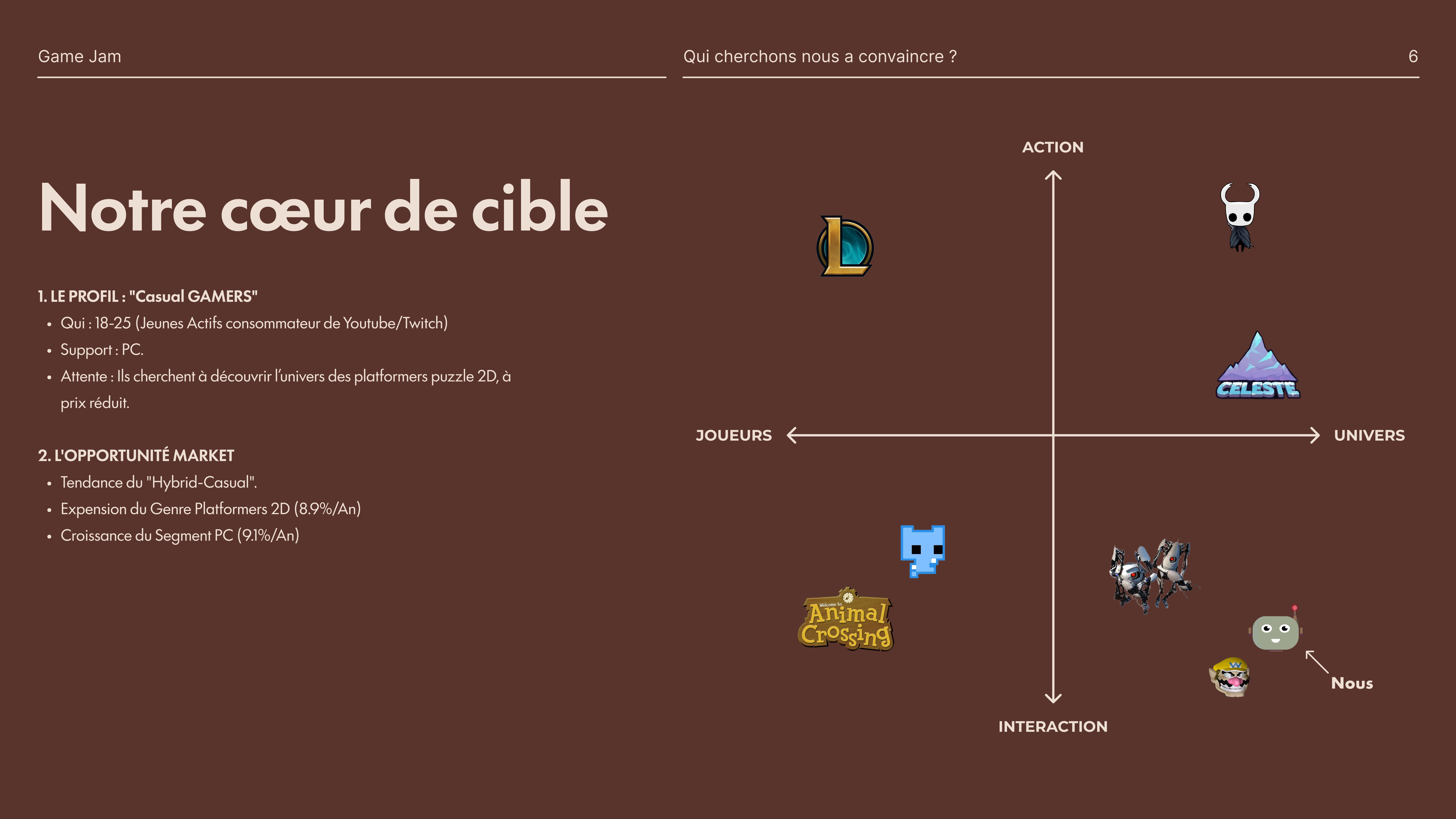 J'ai piloté la création du Pitch Deck de A à Z : | Analyse Concurrentielle (SWOT) : Étude des succès du genre (Celeste, Gris) pour calibrer notre prix et notre durée de vie (6h). | Business Plan : Calcul du coût de production (TJM équipe) et définition du seuil de rentabilité (47 000 ventes). | Roadmap Marketing : Planification d'une campagne de lancement basée sur l'Early Access et le Steam Next Fest.