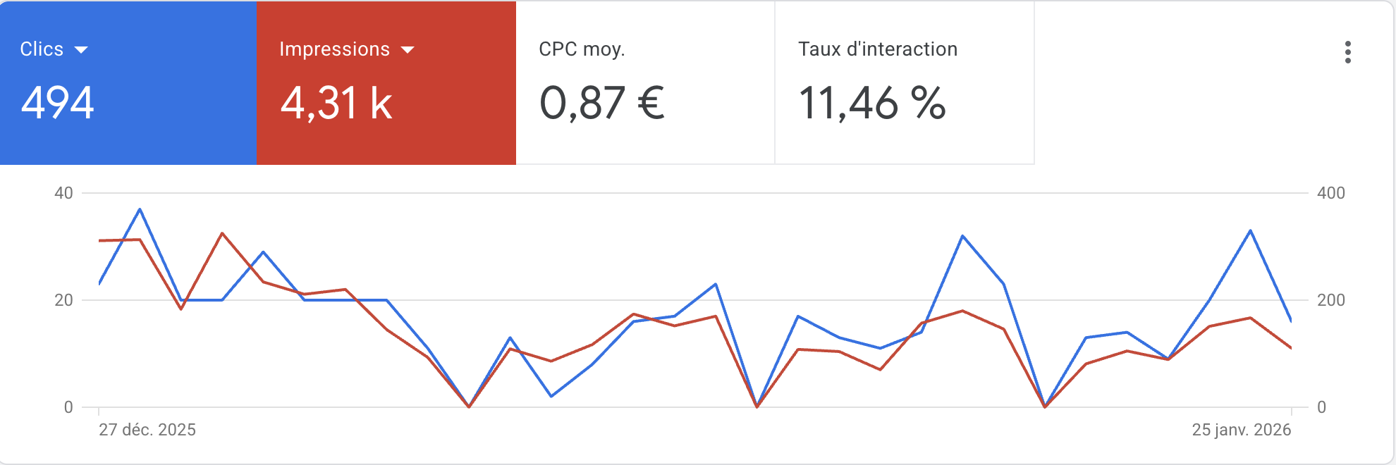 CTR RECORD : 11,5% | 494 CLICS / MOIS | Les résultats sont bien au-dessus des standards du marché (moyenne secteur : ~7%). Avec un taux de clic de 11,46%, la campagne a généré près de 500 prospects qualifiés vers la fiche Google Business en 30 jours, pour un coût par clic maîtrisé de 0,87€.